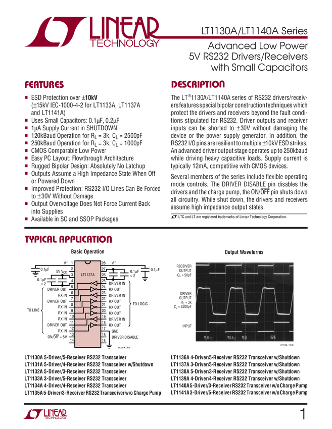 Advanced Low Power 5V RS232 Drivers/Receivers with Small Capacitors (Includes LT1130 thru LT1141)