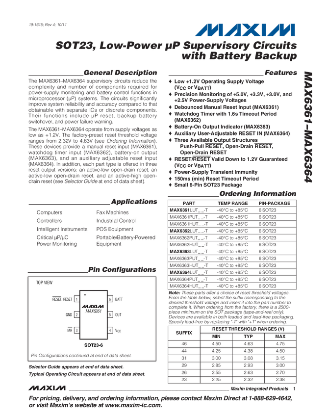 MAX6361L SOT23, Low-Power Microprocessor Supervisory Circuits with Battery Backup