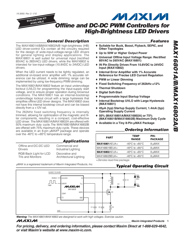 MAX16801A Offline and DC-DC PWM Controllers for High-Brightness LED Drivers