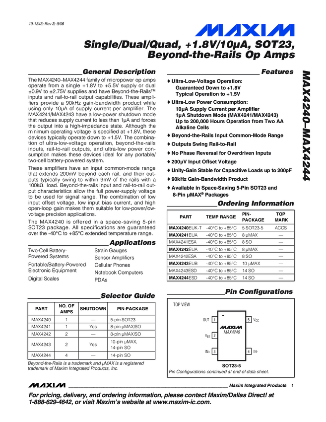 MAX4240 Single/Dual/Quad, +1.8V/10µA, SOT23, Beyond-the-Rails Op Amps