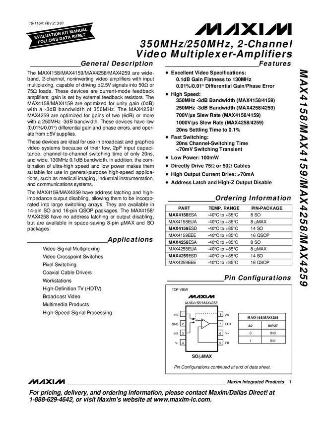 MAX4158 350MHz/250MHz, 2-Channel Video Multiplexer-Amplifiers