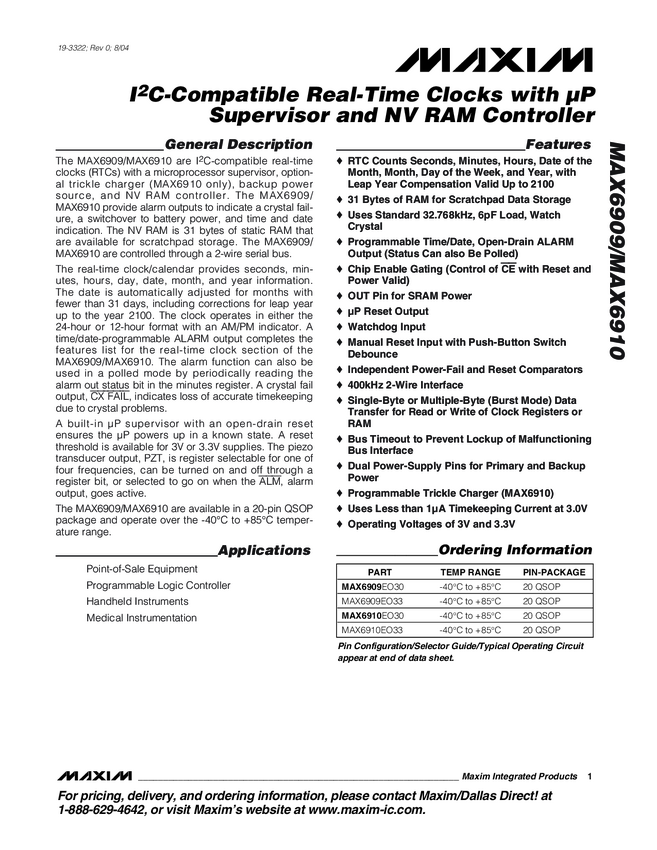 MAX6910 I²C-Compatible Real-Time Clocks with µP Supervisor and NV RAM Controller