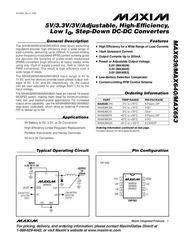 MAX640 5V/3.3V/3V Adjustable, High-Efficiency, Low-I, Step-Down DC-DC Converters