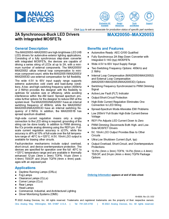 MAX20053 2A Synchronous -Buck LED Drivers with Integrated MOSFETs