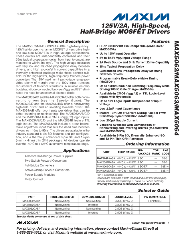 MAX5064B 125V/2A, High-Speed, Half-Bridge MOSFET Drivers