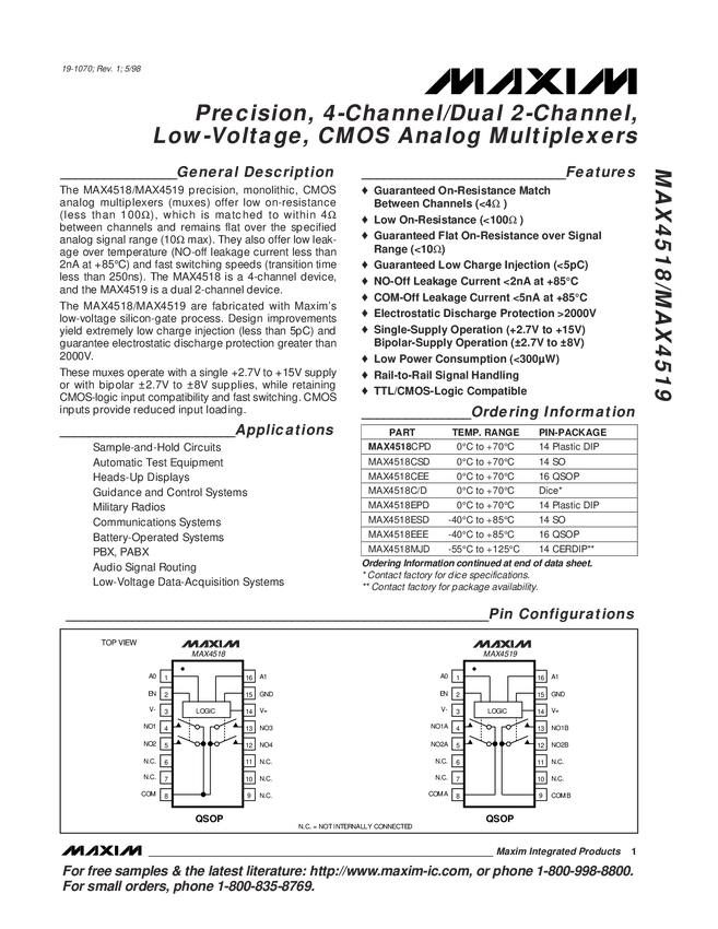 MAX4519 Precision, 4-Channel/Dual 2-Channel, Low-Voltage, CMOS Analog Multiplexers