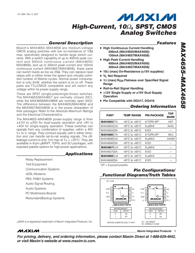 MAX4656 High-Current, 10Ω, SPST, CMOS Analog Switches