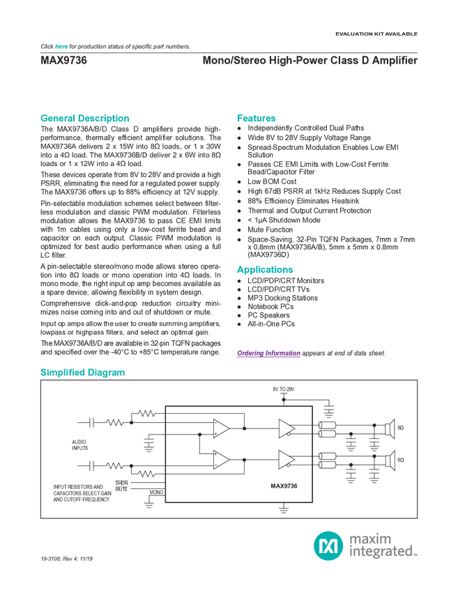 MAX9736A Mono/Stereo High-Power Class D Amplifier