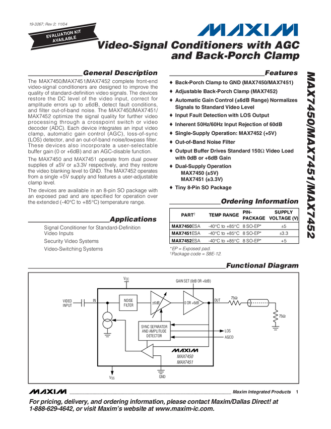 MAX7450 Video-Signal Conditioners with AGC and Back-Porch Clamp
