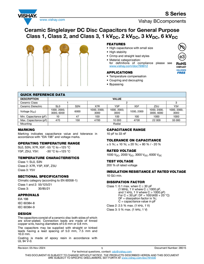 S Series Ceramic Singlelayer DC Disc Capacitors for General Purpose Class 1, Class 2...