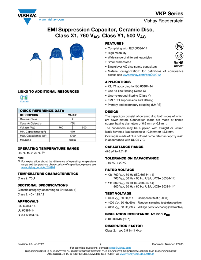 VKP Series EMI Suppression Capacitor, Ceramic Disc, Class X1, 760 VAC, Class Y1, 500 V...