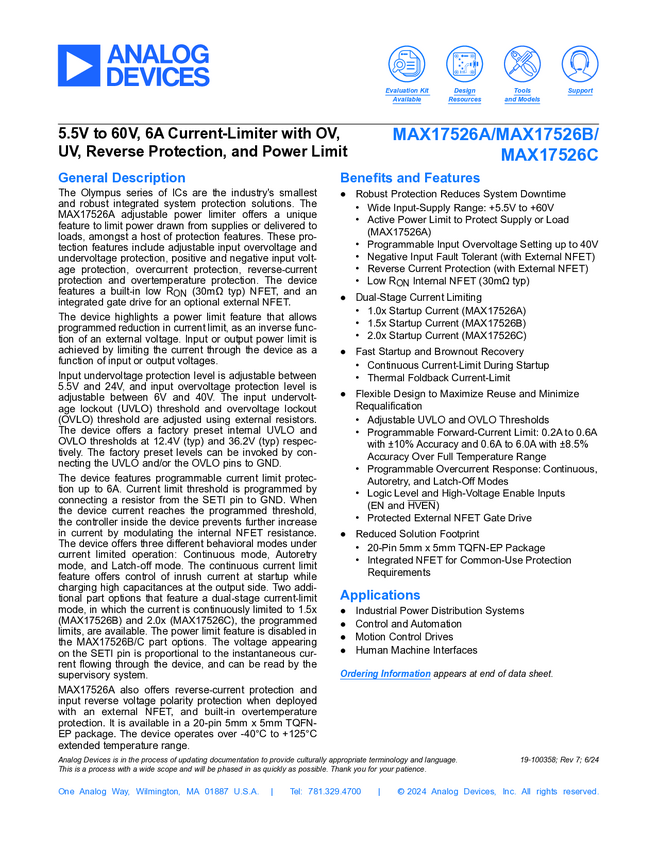 MAX17526A 5.5V to 60V, 6A Current-Limiter with OV, UV, Reverse Protection, and Power...