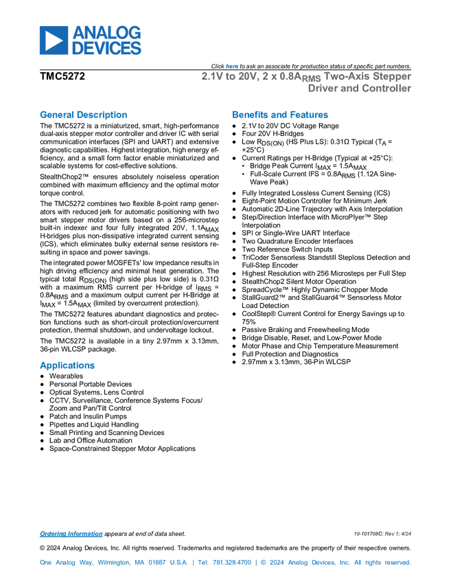 TMC5272 2.1V to 20V, 2 × 0.8ARMS Two-Axis Stepper Driver and Controller