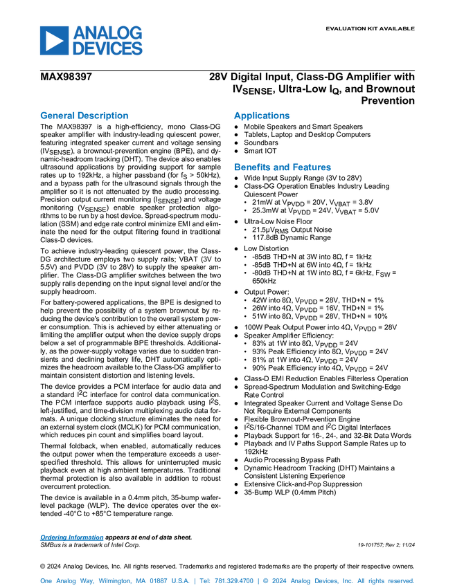 MAX98397 28V Digital Input, Class-DG Amplifier with IV, Ultra-Low I, and Brownout Pr...