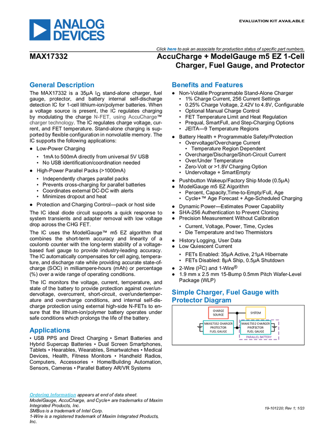 MAX17332 AccuCharge + ModelGauge m5 EZ 1-Cell Charger, Fuel Gauge, and Protector