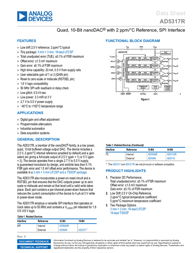 AD5317R Quad, 10-Bit DAC with 2 ppm/°C Reference, SPI Interface
