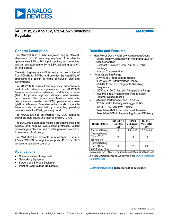 MAX20806 6A, 3MHz, 2.7V to 16V, Step-Down Switching Regulator