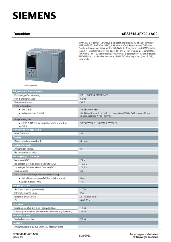 CPU PLC Siemens 6ES7518-4FX00-1AC0 6ES75184FX001AC0