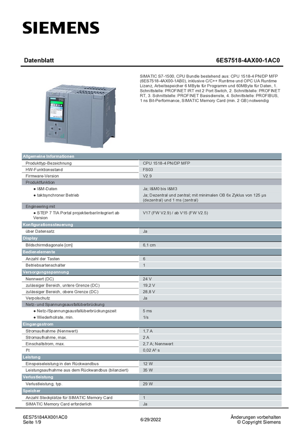 CPU PLC Siemens 6ES7518-4AX00-1AC0 6ES75184AX001AC0