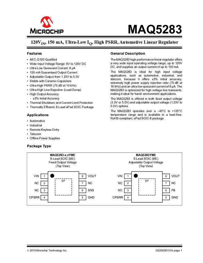 MAQ5283 120VIN, 150mA, Ultra-Low IQ, High-PSRR Automotive Linear Regulator