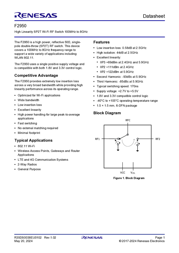 F2950EVBI Evaluation Board for High Linearity Broadband SP2T WiFi 100MHz to 8GHz RF S...