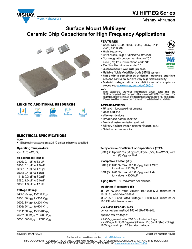 VJ HIFREQ Series Surface Mount Multilayer Ceramic Chip Capacitors for High Frequency Applica...