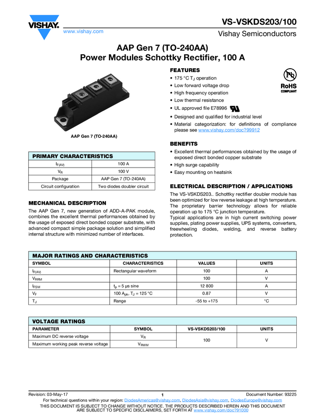 VS-VSKDS203/100 ADD-A-PAK Gen 7 Power Modules Schottky Rectifier, 100 A