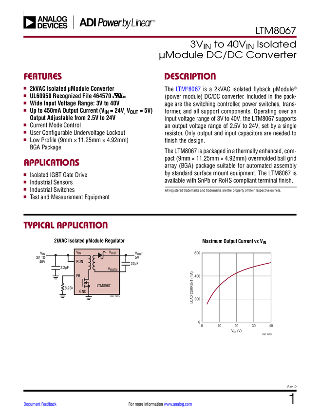 LTM8067 3V to 40V Isolated μModule DC/DC Converter