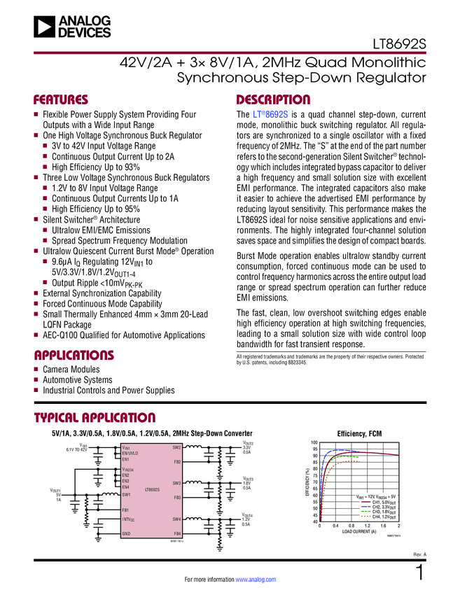 LT8692S 42V/2A + 3× 8V/1A, 2MHz Quad Monolithic Synchronous Step-Down Regulator