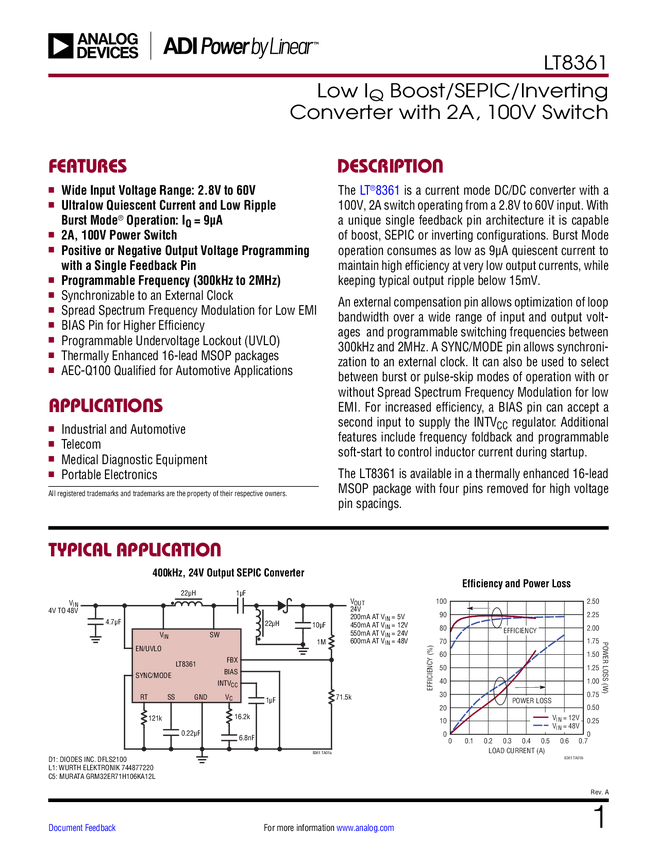 LT8361 Low I Boost/SEPIC/Inverting Converter with 2A, 100V Switch