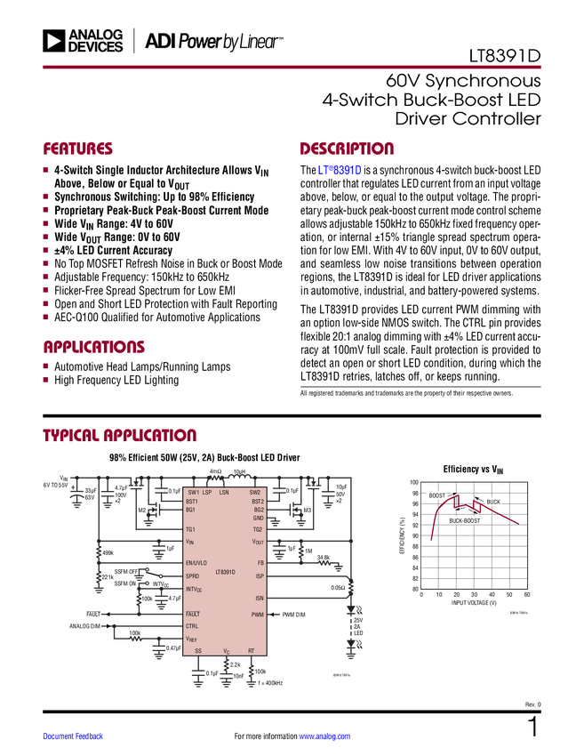 LT8391D 60V Synchronous 4-Switch Buck-Boost LED Driver Controller