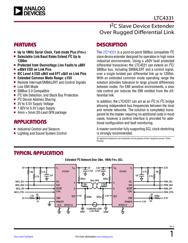 LTC4331 IC Slave Device Extender Over Rugged Differential Link