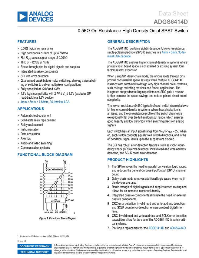 ADGS6414D 0.56Ω On Resistance High Density Octal SPST Switch