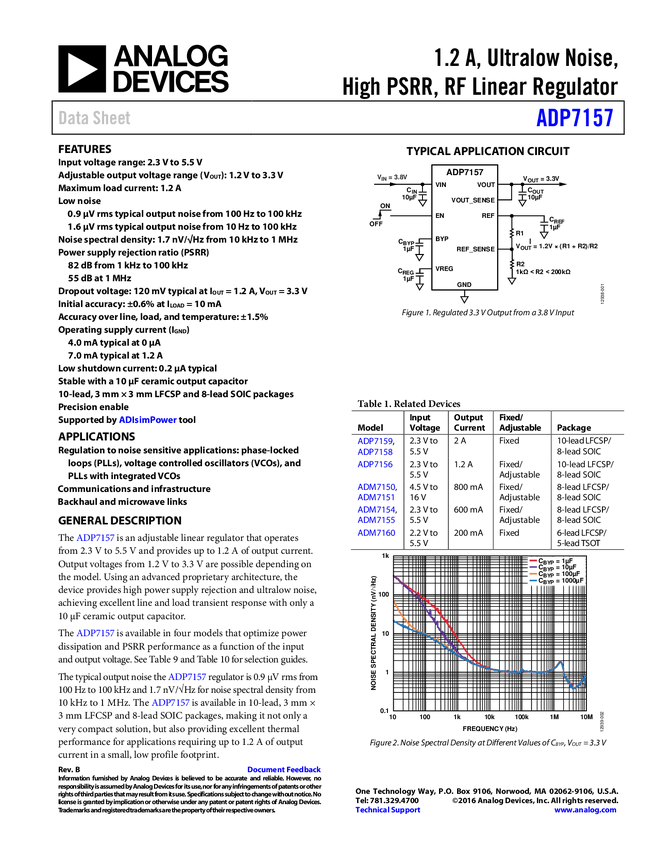 ADP7157 1.2 A, Ultralow Noise, High PSRR, Adjustable Output, RF Linear Regulator