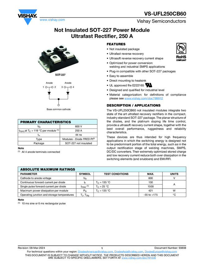 VS-UFL250CB60 Not Insulated SOT-227 Power Module Ultrafast Rectifier, 250 A