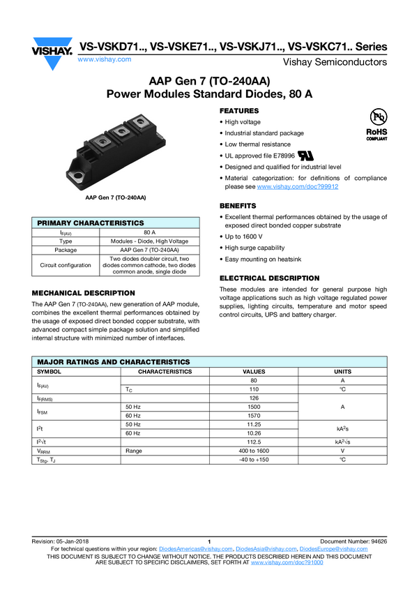 VS-VSKD71.. AAP Gen 7 (TO-240AA) Power Modules Standard Diodes, 80 A