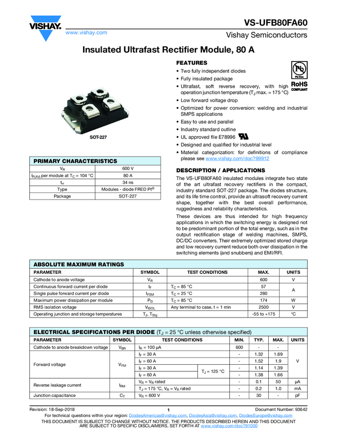 VS-UFB80FA60 Insulated Ultrafast Rectifier Module, 80 A