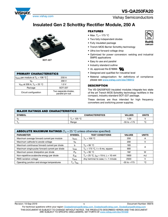 VS-QA250FA20 Insulated Gen 2 Schottky Rectifier Module, 250 A
