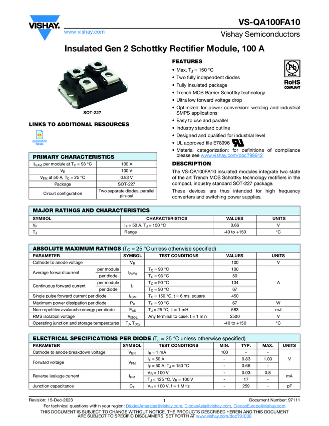 VS-QA100FA10 Insulated Gen 2 Schottky Rectifier Module, 100 A