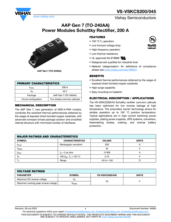 VS-VSKCS200/045 AAP Gen 7 (TO-240AA) Power Modules Schottky Rectifier, 200 A