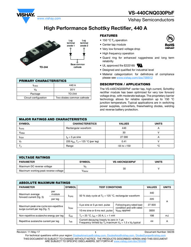 VS-440CNQ030PbF High Performance Schottky Rectifier, 440 A