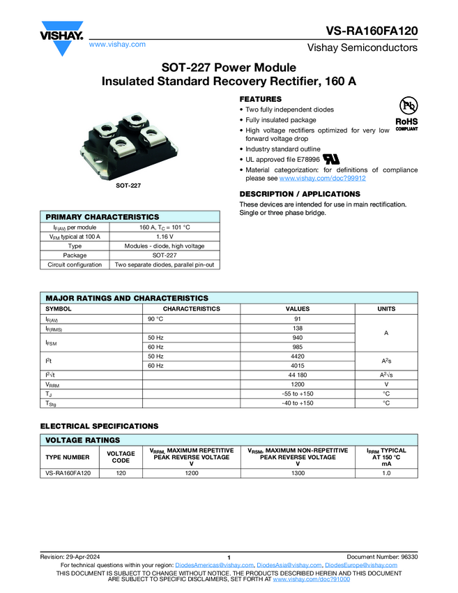 VS-RA160FA120 SOT-227 Power Module Insulated Standard Recovery Rectifier, 160 A