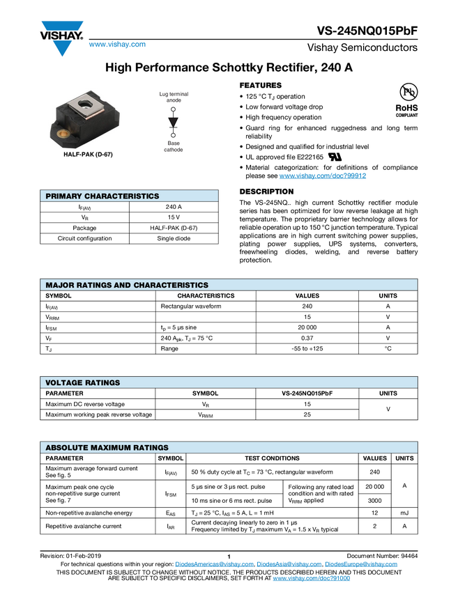 VS-245NQ015PbF High Performance Schottky Rectifier, 240 A