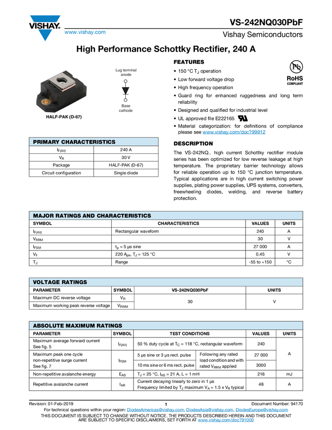 VS-242NQ030PbF High Performance Schottky Rectifier, 240 A