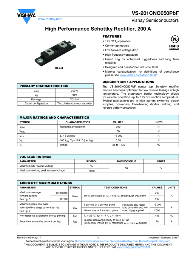 VS-201CNQ050PbF High Performance Schottky Rectifier, 200 A