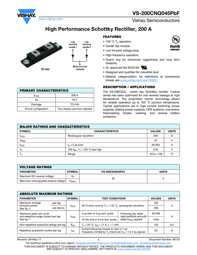 VS-200CNQ045PbF High Performance Schottky Rectifier, 200 A