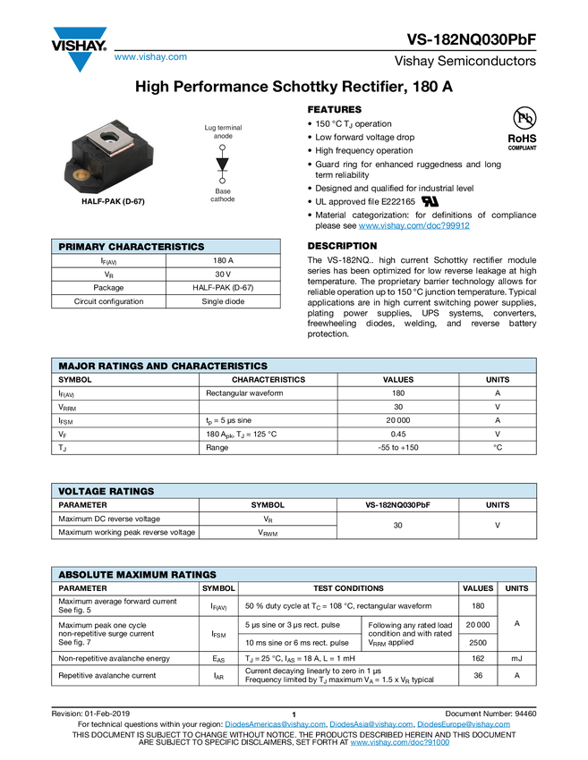 VS-182NQ030PbF High Performance Schottky Rectifier, 180 A