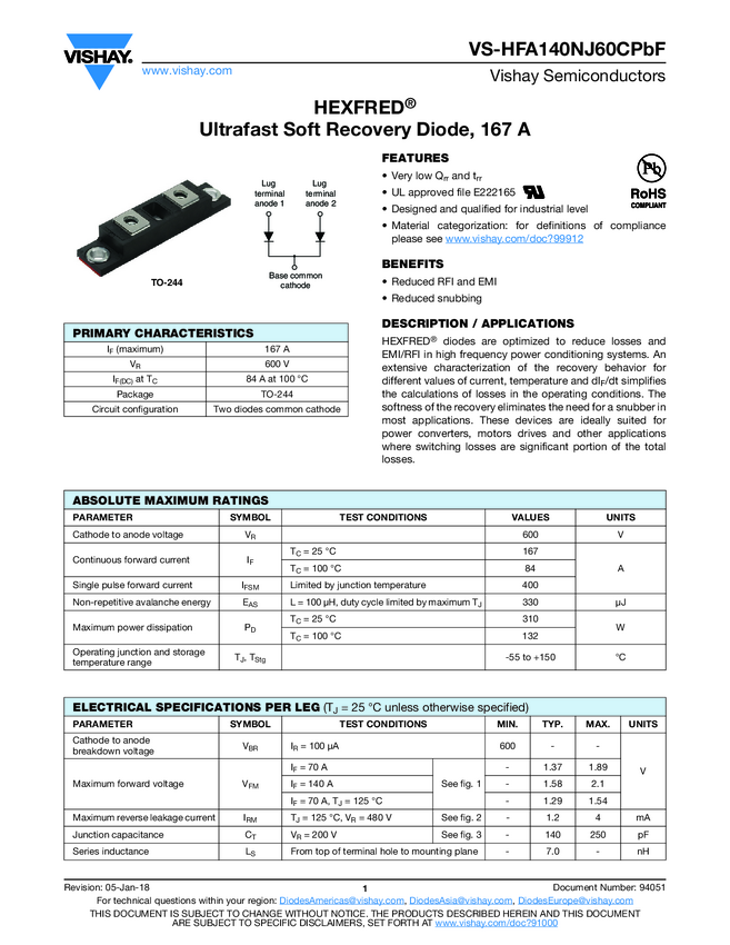 VS-HFA140NJ60CPbF HEXFRED® Ultrafast Soft Recovery Diode, 167 A