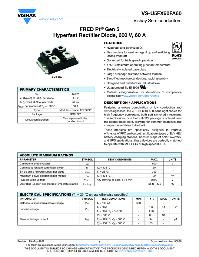 VS-U5FX60FA60 FRED Pt® Gen 5 Ultrafast Rectifier Diode Module, 1200 V, 120 A