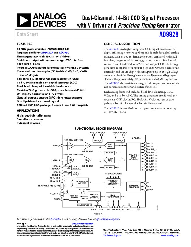 AD9928 Dual Channel 14-Bit CCD Signal Processor with V-Driver and Generator